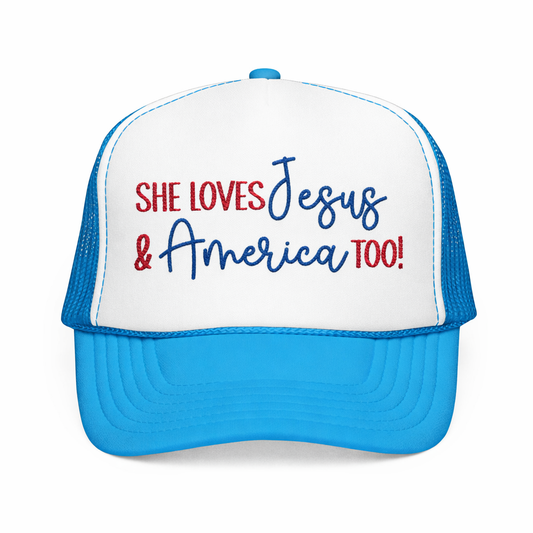 She Loves Jesus & America Too! Embroidered Trucker Hat
