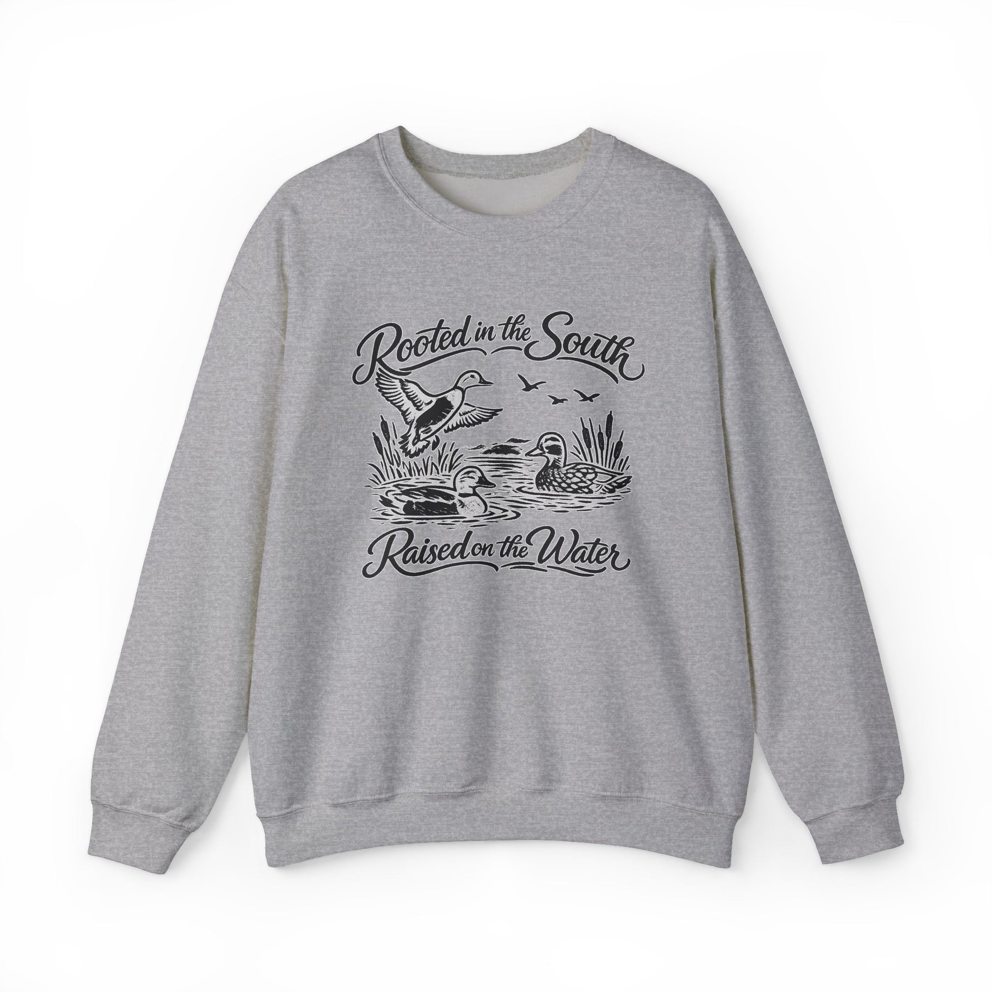 Lightweight warmth with a slow-summer, back-porch vibe. This crewneck carries a hand-drawn marsh scene—ducks lifting off, cattails bending, and the script: “Rooted in the South / Raised on the Water.” It settles soft against the skin, the fit roomy but neat at the shoulders, and the ribbed collar and cuffs keep shape through repeated wears. Wear it for cool mornings on the dock, late-night bonfires, or slow drives down two-lane roads. The embroidered options let you add a subtle stitched logo at chest or wrists, while printed neck and wrist labels keep the interior smooth and comfortable. Ethically sourced cotton and durable double-needle seams mean this becomes one of the go-to pullovers you reach for when you want comfort and a quiet nod to home.